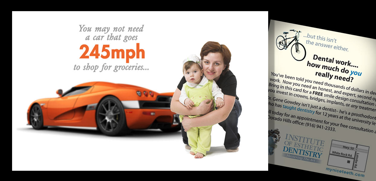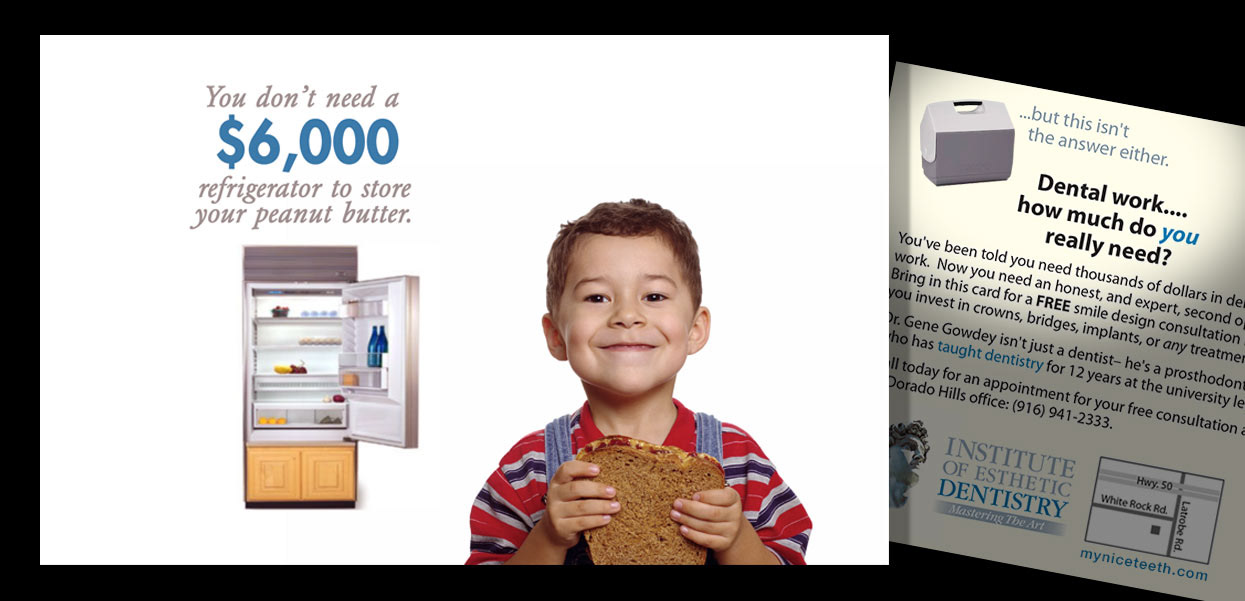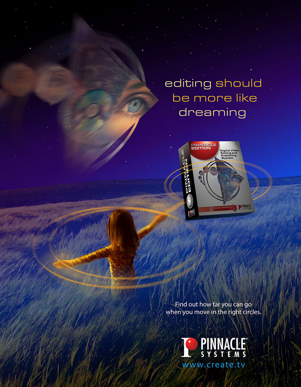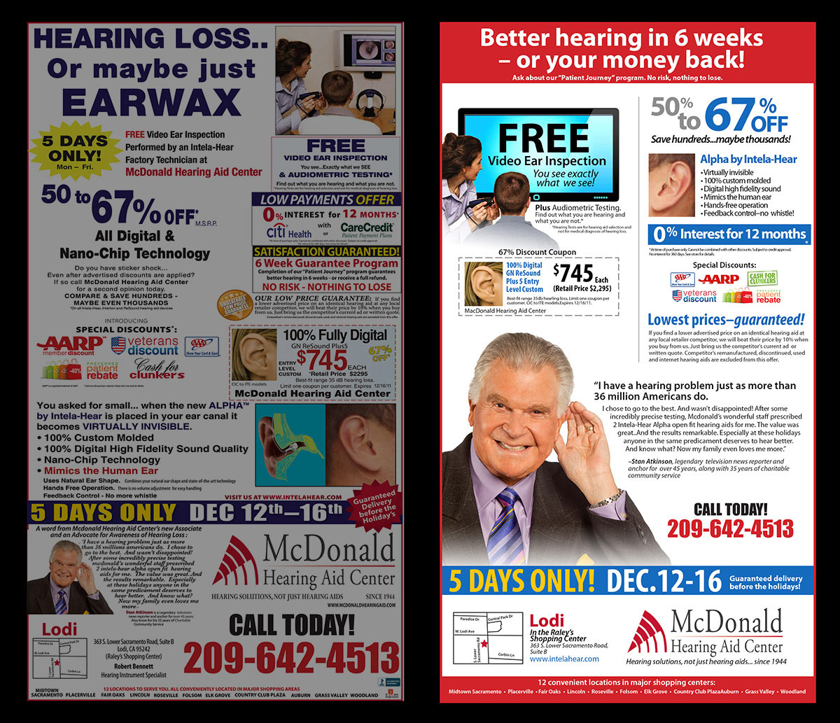 MLK ad: my concept, design and production...and one of my favorite quotes from Dr. King. • This direct mail campaign for an El Dorado Hills dental practice yielded a high response rate • Full-page Sacramento Bee ads; the left-hand ad, created in-house, had gotten a poor ROI. I was hired by Tucker Media Group to completely redesign it. The endorsement was the grabber; Stan was an instantly recognizable news anchor for their older target demographic in the Sacramento market. For several years, he anchored the nation's top-rated local 11pm newscast on KCRA. • I designed, art directed and produced 22 retail boxes for Pinnacle, and created a crop circle identity for their high-end, prosumer product line.
