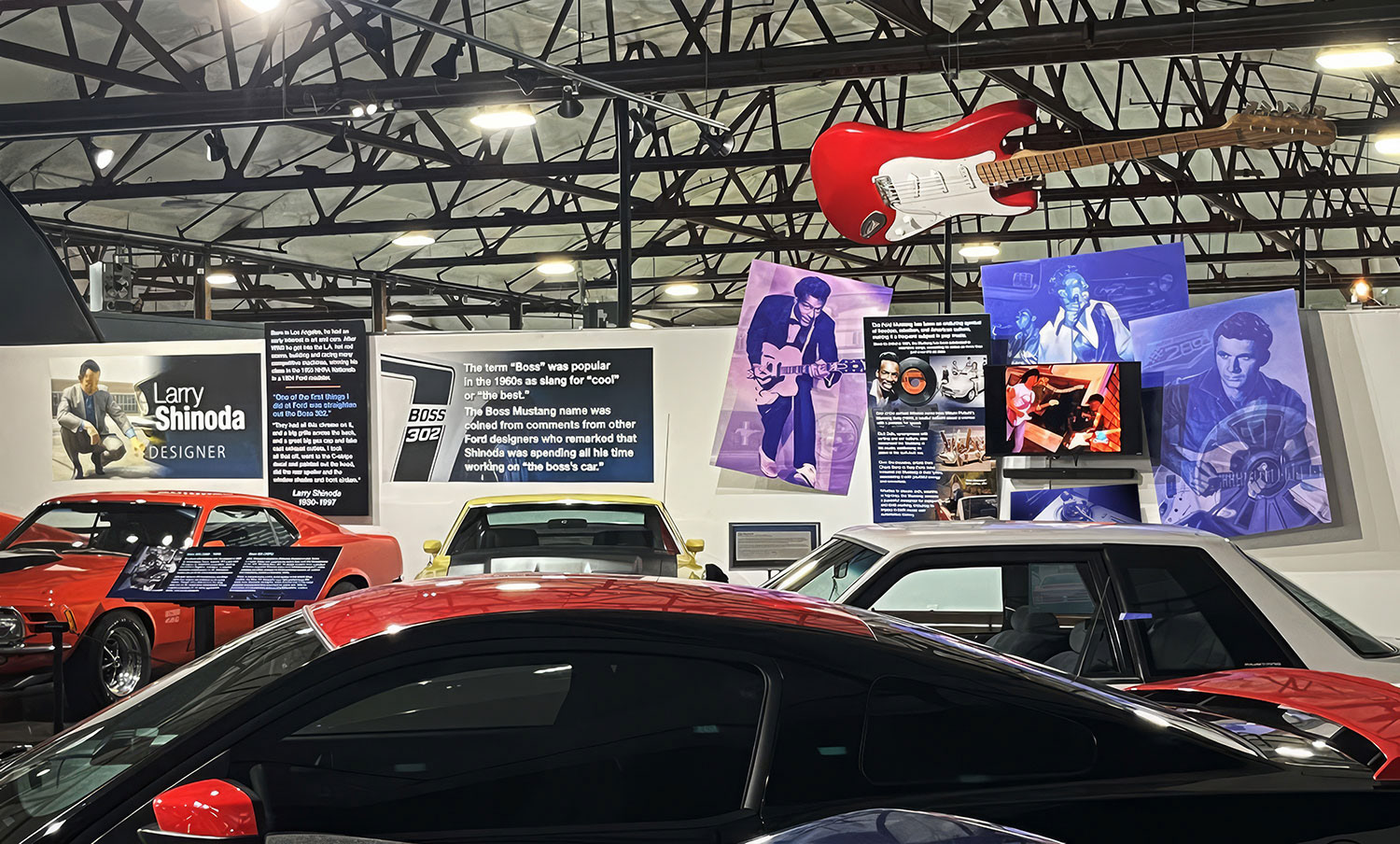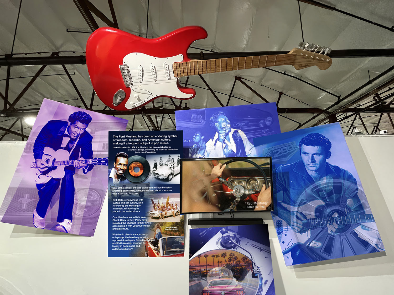 This display is in "Wild Horses: The Mustang's Sixtieth Anniversary" exhibit in the The California Automobile Museum. I wanted to bring in music that celebrates the car and the culture that surrounds it. Mustang-themed music videos play on a loop. • I made Coroplast standoffs for the graphic panels to angle them out from the wall and give the display some life. The 12' Fender Stratocaster? I created it in 2011, and the museum is the third owner. What a long, strange trip it's been...